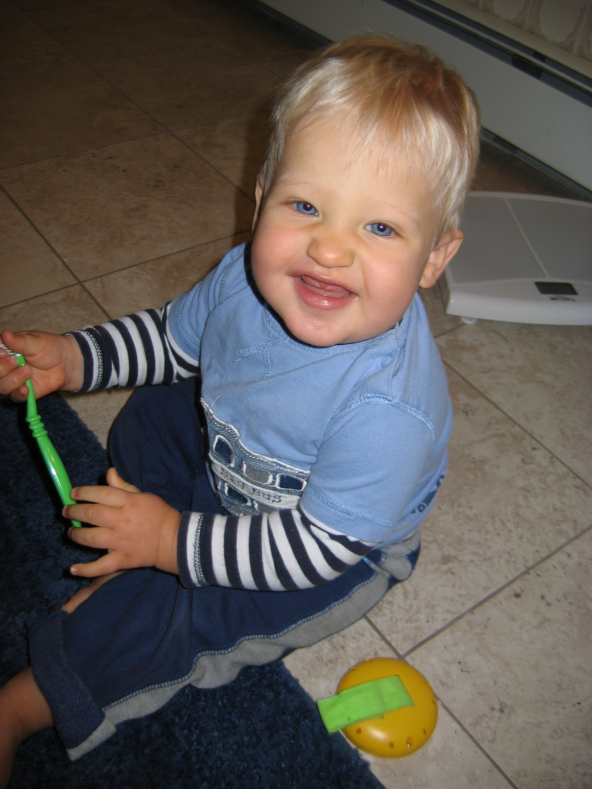 The other day, I was brushing my teeth while Joash was in the tub. I looked at him and thought, "You have teeth. We should probably be brushing them."
